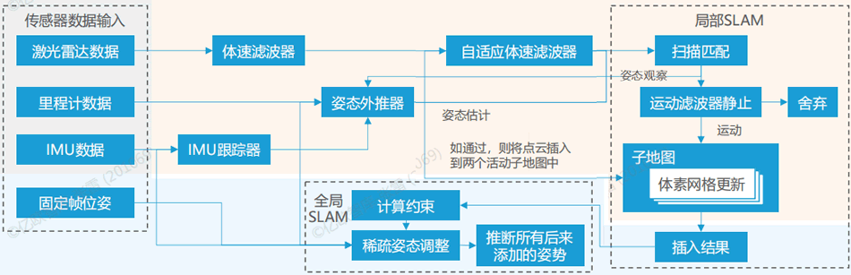 以谷歌開發(fā)的二維SLAM算法Cartographer為例:算法在前端完成占據(jù)柵格地圖的構(gòu)建,得出激光雷達(dá)掃描幀的佳位姿后,將掃描幀插入到子地圖中,得到局部?jī)?yōu)化的子地圖并記錄位姿;后端根據(jù)掃描幀間的位姿關(guān)系進(jìn)行全局的地圖優(yōu)化,得出閉環(huán)掃描幀在全局地圖中的佳位姿。