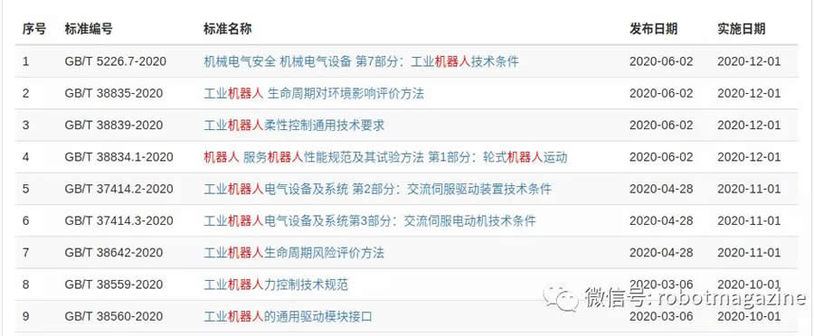 6月2日,4項與機器人相關的新增國家推薦標準發布,這4項標準均從2021年1月1日開始實施。