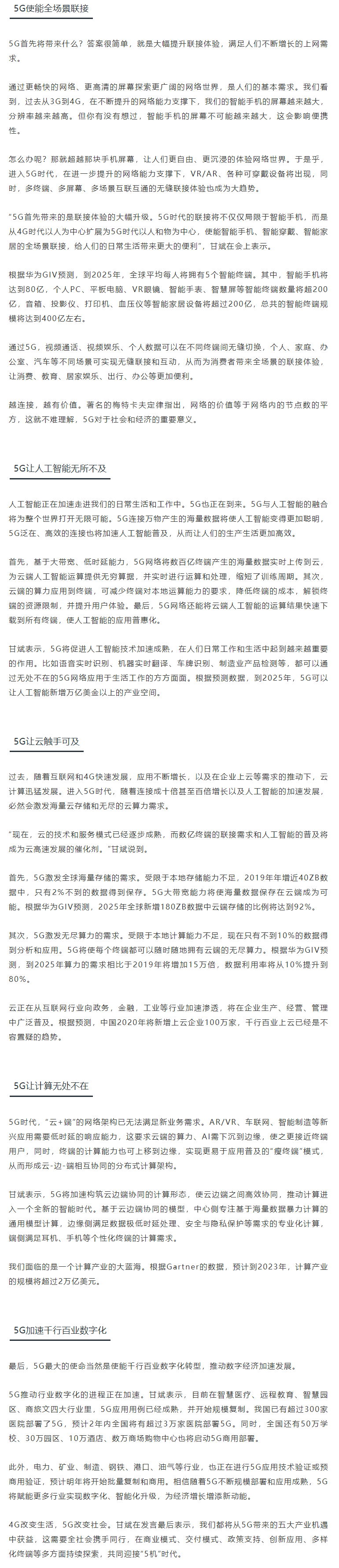 2020年6月30日,在GSMA舉辦的新基建與企業數字化論壇上,華為無線網絡S席營銷官甘斌發表了《5G=5“機”,新價值,新機遇》的主題演講。會上,甘斌詮釋了5G將驅動聯接、AI、云、計算、行業應用五大產業升級,為數字經濟發展注入新動能。