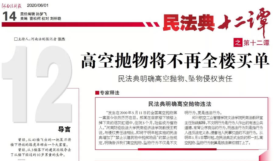 “發(fā)生在2000年5月11日的全國G空拋物D一案至今依然歷歷在目。郝某在自家樓下被樓上掉下來的煙灰缸砸中,住院5個月,險些成為植物人。”河南財經(jīng)政法大學(xué)民商經(jīng)濟法學(xué)院教授王莉說,與侵權(quán)責(zé)任法相比,即將于明年起實施的民法典增加了“禁止從建筑物中拋擲物品”的禁止性規(guī)定,明確告訴我們G空拋物、墜物行為不僅是不文明行為,更是違法行為。