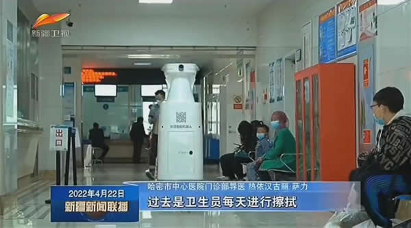 哈密市中心醫院門診部導醫熱依漢古麗·薩力說:“現在有了智能消毒機器人,設定好程序后,可以無死角的自動進行消殺,對我們和患者帶來了更方便的就醫環境!