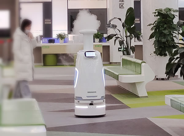 “基本沒有噪音,非常靈活,它是我們這里靚的仔!”,在G新區(qū)政務(wù)服務(wù)中心大廳內(nèi),智能霧化消毒機(jī)器人正在忙碌工作。一說起它,工作人員都會(huì)豎起大拇指。