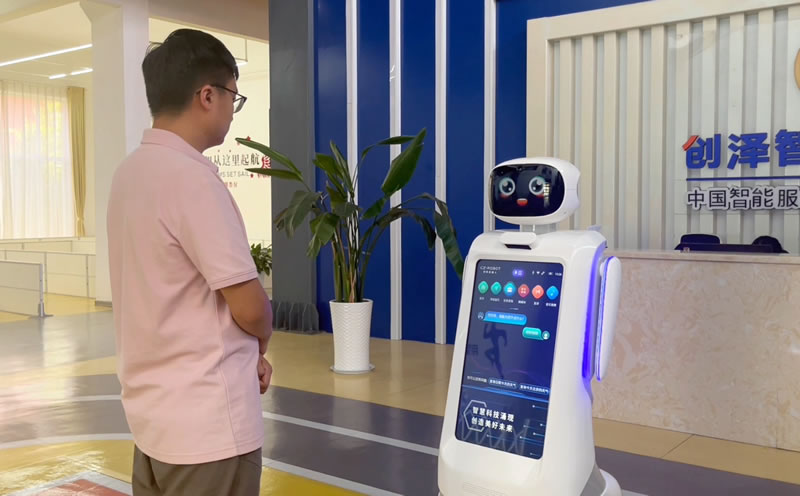 一來到創澤公司前臺,一名機器人接待員便主動迎上前來。它不但可以詢問你的來訪目的,還可以為你做信息登記,向你介創澤基本情況、業務實力、黨建特色、所獲榮譽;它可以引L你到接待室,也能對一些問詢做出基本回答。