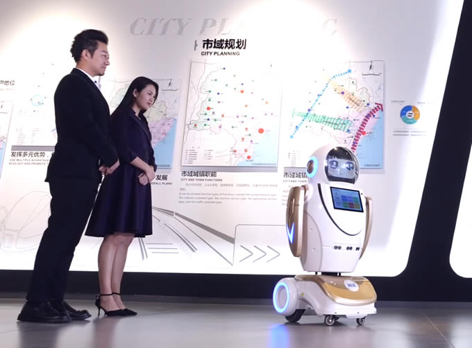機器人能夠一邊引導觀眾參觀,到達每一個展位還能進行專業的講解服務,機器人不知疲勞,沒有心情不好的時候,不會又小情緒,在展館展廳的講解服務方面會比人工做的更到位。
