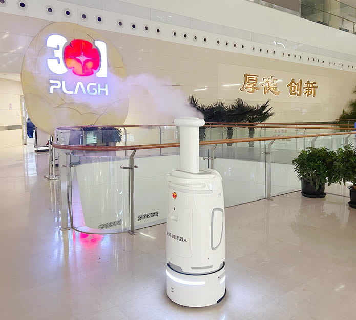 在中國人民解放軍總醫院D一醫學中心的門診大廳里,創澤智能消毒機器人頭D噴霧在醫院門診大廳走來走去進行全域消毒殺菌,實現消毒效果量化管理