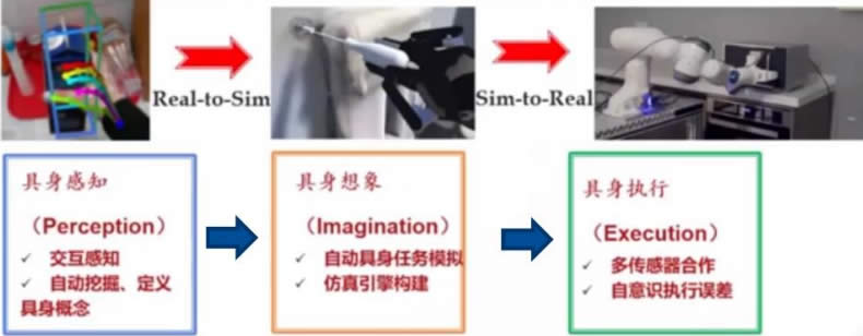 不僅僅理解行為,更需要能執(zhí)行行為,機(jī)器人能夠執(zhí)行行為才是真正理解行為。 通過計(jì)算機(jī)視覺以及行為認(rèn)知識(shí)別, 讓機(jī)器人能夠確認(rèn)和分辨一個(gè) 行為僅僅只是D一步,這也只是傳統(tǒng)旁觀式 AI 學(xué)習(xí)所達(dá)到的功能水平, 例如,傳統(tǒng) AI 學(xué)習(xí)可以讓機(jī)器學(xué)習(xí)"盒子,概念并在新的場景中說出 "盒子, 這個(gè)標(biāo)簽, 但在具身智能學(xué)習(xí)模式中, 機(jī)器通過感知環(huán)境實(shí)體, 通過親身體驗(yàn)完成具身學(xué)習(xí),終理解場景并形成"打開,這個(gè)概念。 因此, 當(dāng)機(jī)器可以執(zhí)行該行為才是具身智能的落腳點(diǎn)。