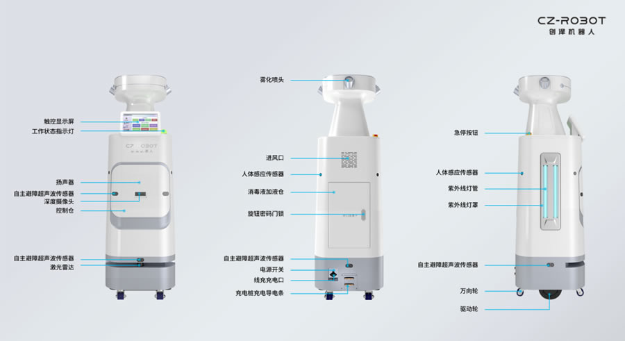 消毒機器人編號:CZ-RobotDf-DZ,可實現等離子消毒、紫外線消毒、地面消毒等多模式智能消毒,通過智能軟件管理。實現智能化消毒